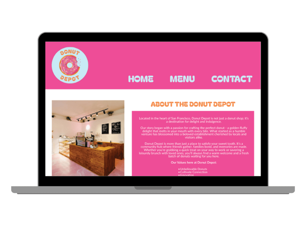 Designed and built a one-page website for Donut Depot as part of a web design and coding class, featuring a custom logo, branding, and responsive layout for mobile and desktop.
