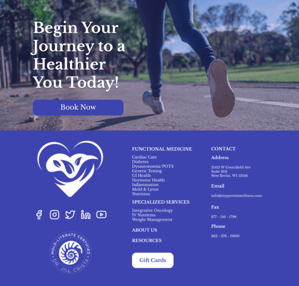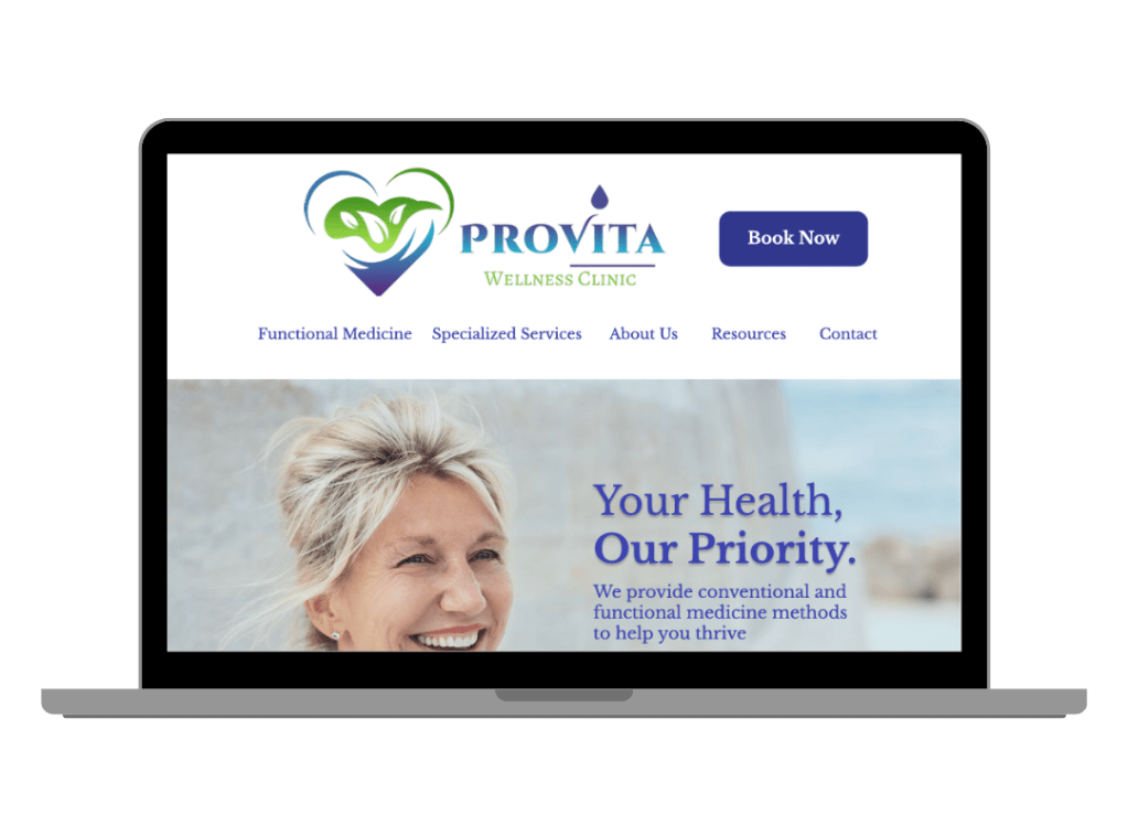 Crystal Dillett, owner of ProVita Wellness, wanted to improve her website’s structure and clarity to better communicate the services she offers. To achieve this, I redesigned six key pages: the Home page, About Us page, Specialized Services page, Functional Medicine page, Resources page, and Contact page. The focus was on improving organization, readability, and user experience while maintaining a clean and professional design.
